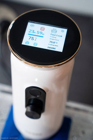Der Betriebsbereich liegt zwischen 0 und 90° Celsius und deckt damit so ziemlich jedes sous-vide gegarte Gericht ab.