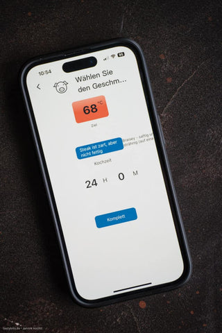 Dank WiFi sowie der INKBIRD Smartphone-App kann der Garvorgang jederzeit und überall überwacht werden. Dazu gibt es in der App für Android und iOS (zum App Store | zum Play Store) zahlreiche voreingestellte Temperatureinstellungen und Garzeiten für verschiedene Rezepte und Lebensmittel. Ich habe mal einen Blick auf die Empfehlung für den Schweinebauch geworfen – INKBIRD empfiehlt eine Temperatur von 68° Celsius über 24 Stunden. Gar keine schlechte Idee – ich habe mich aber trotzdem für ein wenig mehr Temperatur entschieden.