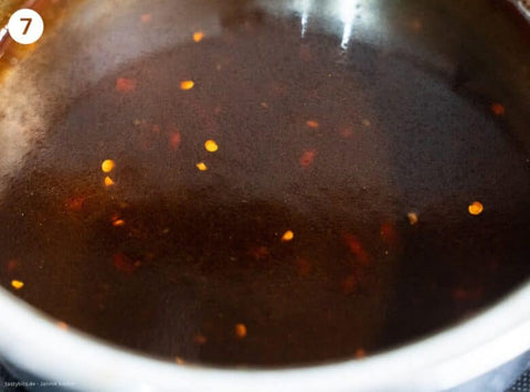 Marinade einkochen:Während das Fleisch im Ofen ist, wird die aufgefangene Sauce in einem Topf dickflüssig eingekocht. Sie ist später eine gute Grundlage für den Schweinebauch und kann beispielsweise als Basis auf den Teller gegeben werden – oder Du verwendest sie einfach als Dip für das Fleisch.