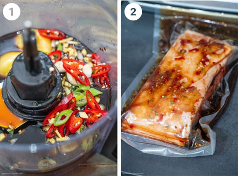 Schweinebauch marinieren:Der Schweinebauch wird gut abgewaschen, abgetrocknet und in einen Vakuumbeutel gegeben. Dann vermengst Du ihn mit der Marinade und vakuumierst alles.