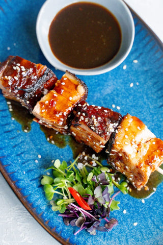 Alternativ kannst Du den Schweinebauch auch mit der Sauce bestreichen und dann auf Holzspießen servieren. Ein wenig warme Sauce kannst Du als Dip dazu reichen.