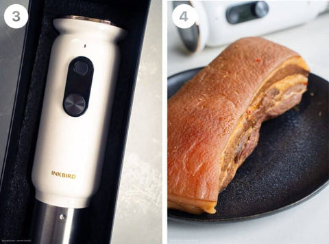 Sous-vide garen:Jetzt stellst Du den INKBIRD Sous-vide-Stick auf eine Temperatur von 75° Celsius ein und lässt den vakuumierten Schweinebauch darin für 24 Stunden garen. Achte darauf, dass der Vakuumbeutel nicht oben schwimmt, sondern vom zirkulierenden Wasser umgeben ist. Sollte das nicht der Fall sein, kannst Du den Beutel beschweren.