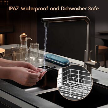 Die INT-11X-B Sonde ist wasserdicht mit einer IP67-Bewertung, sodass Sie sie sicher unter Wasser abspülen oder im Geschirrspüler reinigen können. Beachten Sie jedoch, dass die Ladestation nicht wasserdicht ist, vermeiden Sie also, sie nass zu machen oder abzuspülen. Sie können ein feuchtes Tuch verwenden, um Ölflecken auf der Oberfläche abzuwischen.