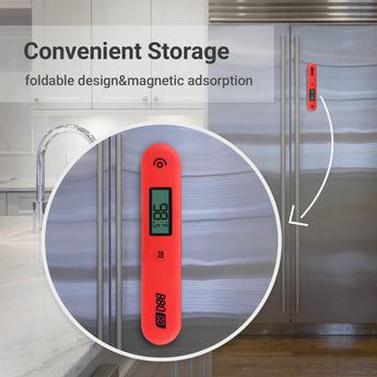 Easy Operation&Convenient Storage: The foldable thermometer is simple to operate, open it to turn on the device and fold the probe back to turn it off. The foldable design and the internal magnet make storage conveniently, the shape is smaller than those can not fold back and the magnetic back make it possible to adsorb on the surface of household appliances such as ovens, refrigerators or other metal surfaces you want to.