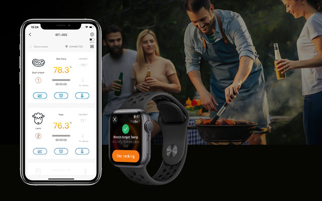 Controle fácilmente la temperatura de su carne en tiempo real y reciba alarmas de temperatura alta/baja en su teléfono o directamente en su muñeca para evitar fallos en la cocción. Aproveche hasta 23 opciones de carne preestablecidas por el USDA en la aplicación para asar a la perfección cada vez.