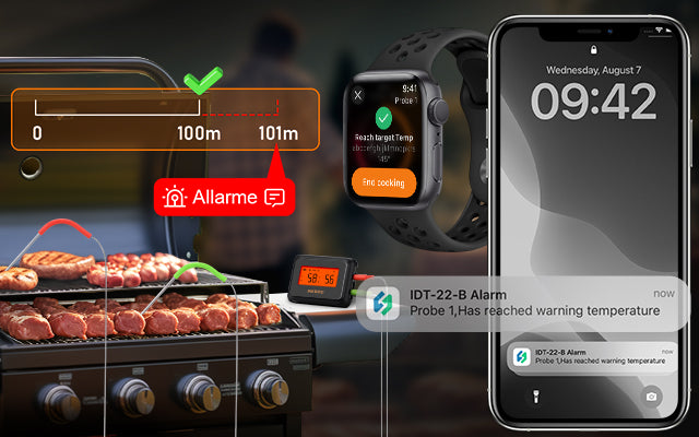 Ez az okos vezeték nélküli grillhőmérő magas/alacsony hőmérséklet riasztással, főzési befejezés előriasztással, túlmelegedés riasztással, alacsony akkumulátor kikapcsolási riasztással, alacsony akkumulátor riasztással és időzítő riasztással rendelkezik.