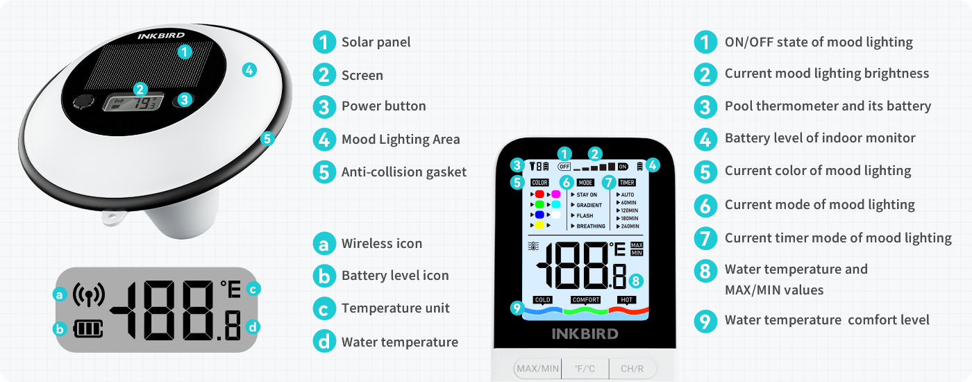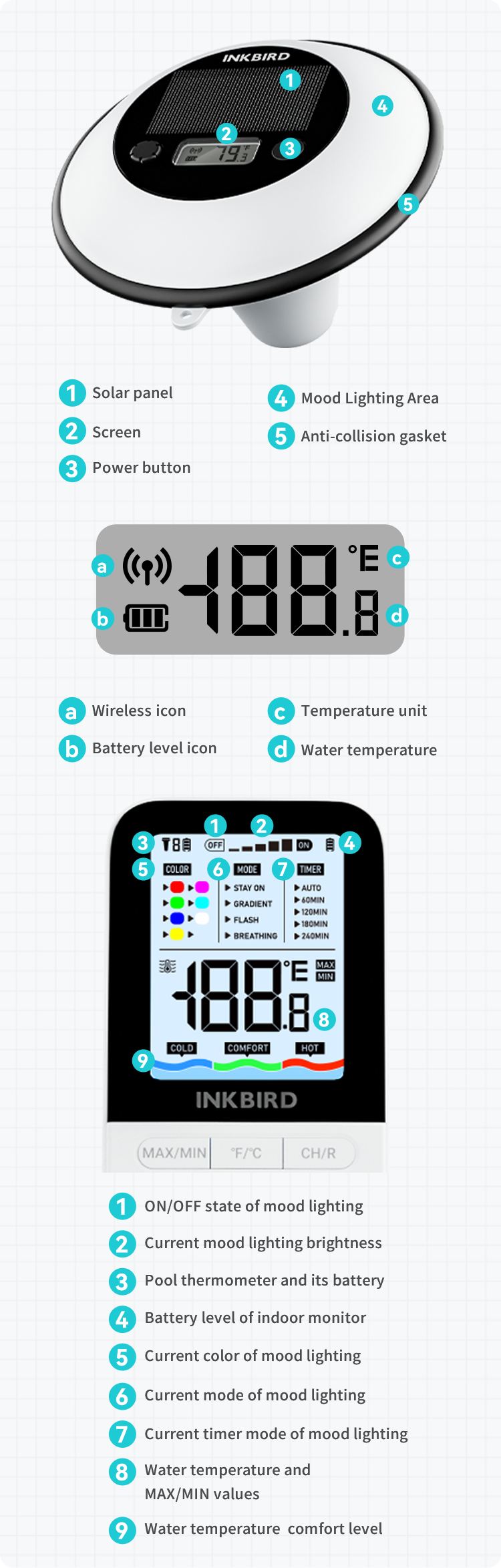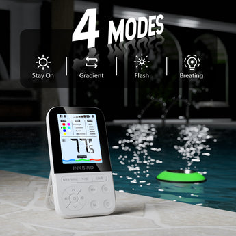 INKBIRD IBS-P05R is a portable pool device that integrates wireless pool temperature monitoring and adjustable mood lighting. It is both environmentally friendly and economical as it is powered by a built-in solar panel and can transmit real-time water temperature data to the indoor receiver with a wireless connection distance of up to 980ft/300m. The mood light not only adds a beautiful touch to nighttime swims with its brightness and color controls, but also automatically adjusts according to external light. Both temperature and lighting functions can be conveniently controlled remotely through the indoor unit.