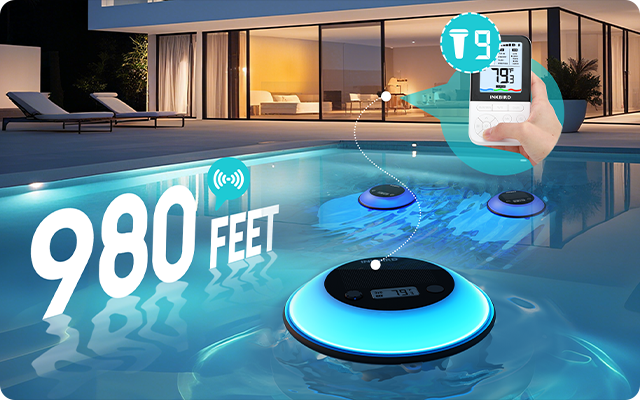 Wireless Monitoring, Up to 9 Channels 980ft/300m wireless range enables remote temperature monitoring and ambient light control. The indoor receiver can connect up to 9 pool thermometers simultaneously, improving multi-scenario management efficiency.