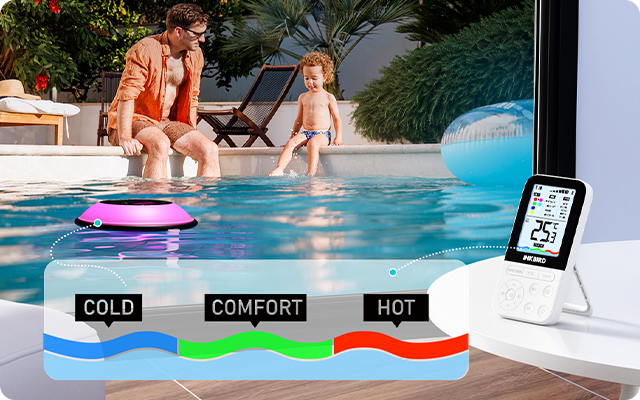 ● Permanent, uninterrupted pool temperature monitoring powered by solar energy ● Up to 6 months backup battery life without sunlight ● IP68 waterproof construction, specialized protection for pools, hot springs, and hot tubs ● Seven-color ambient light with multiple lighting modes, brightness levels, and timers ● Light-sensing technology, auto lighting up at night and off during the day ● 980ft/300m ultra-long transmission distance for extended operational range ● Wide range water temperature monitoring, from 40°F to 158°F (-40°C to 70°C) ● Clear and intuitive water temperature comfort level indication ● Simultaneous control and monitoring of up to 9 pool thermometers