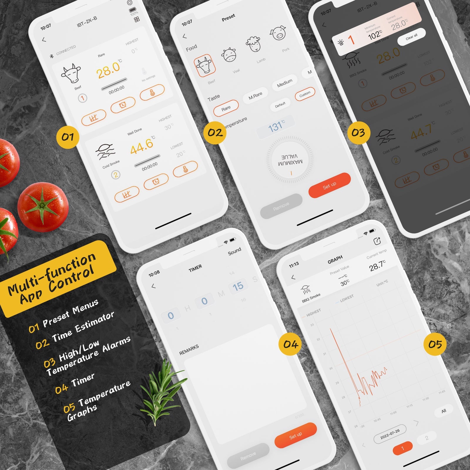 Alarms for safer: INKBIRD IBT-2X supports alarms for the set high and low temperatures, once the detected temperature is reaching the set high/low temperature, its alarm will be triggered and notification will be sent to our mobile phone to alarm us, which is much safer and more efficient for application contexts.