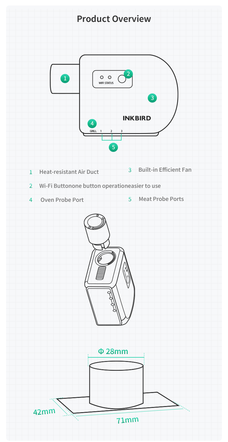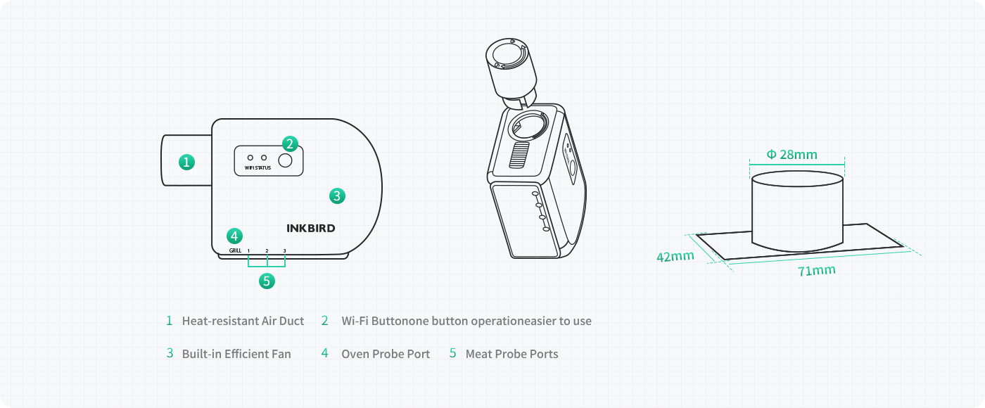 | Package Contents: | BBQ Smoker Temp Controller ISC-027BW *1 Oven Probe *1, Meat Probe *3 USB Power Adapter + Cable *1 Grill Adapter *1 |