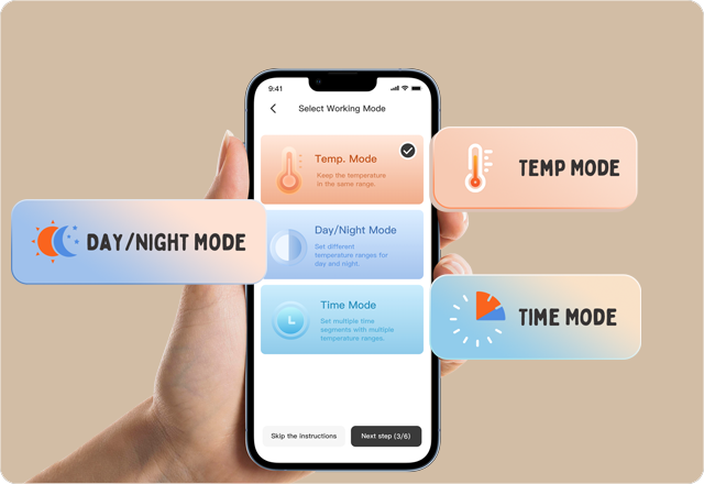 Up to 12 periodic temperature ranges per day in Time mode; two temperature ranges in Day/Night mode; adjustable desired start and stop temperature in Temp mode. All for automcatic heater/cooler operation.