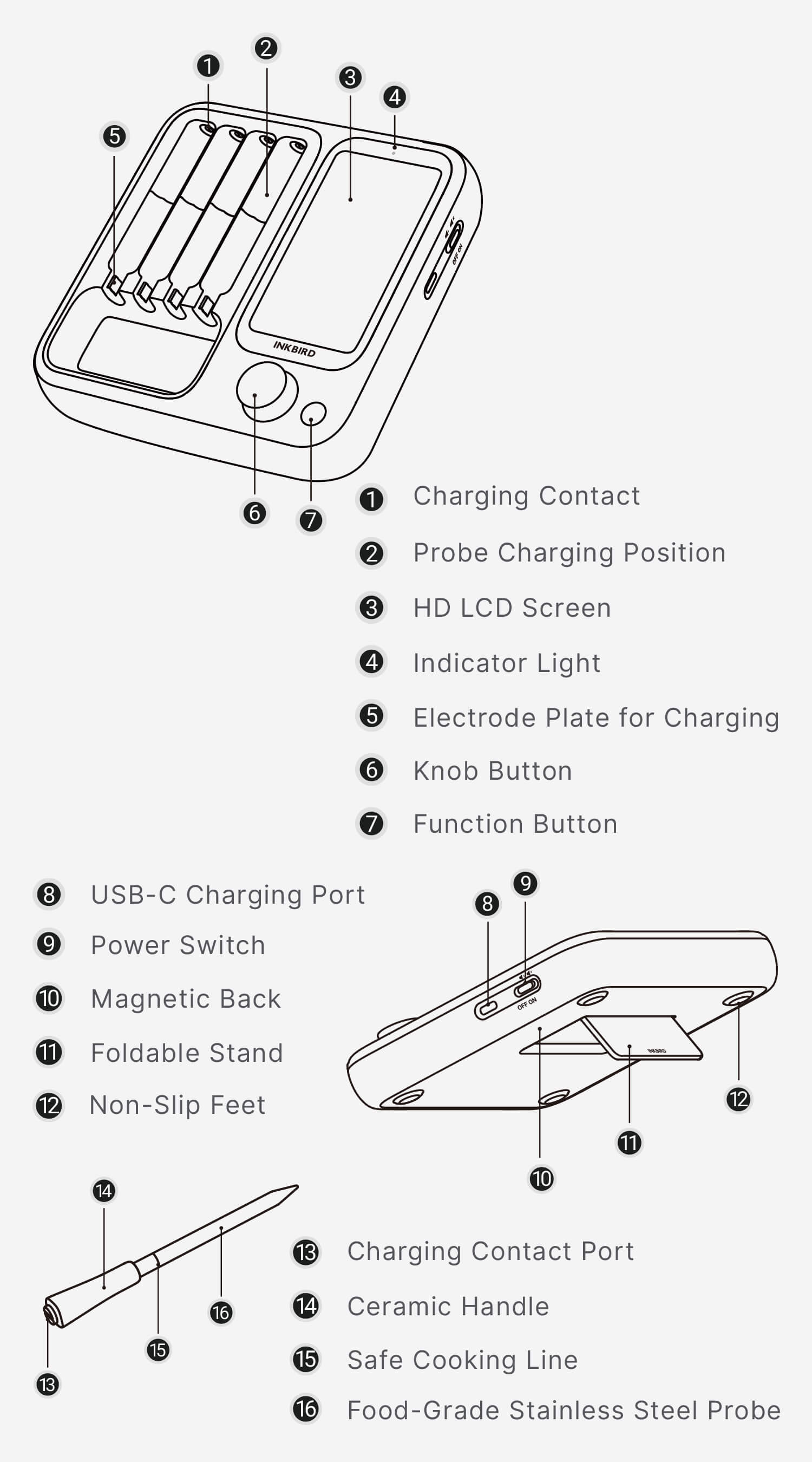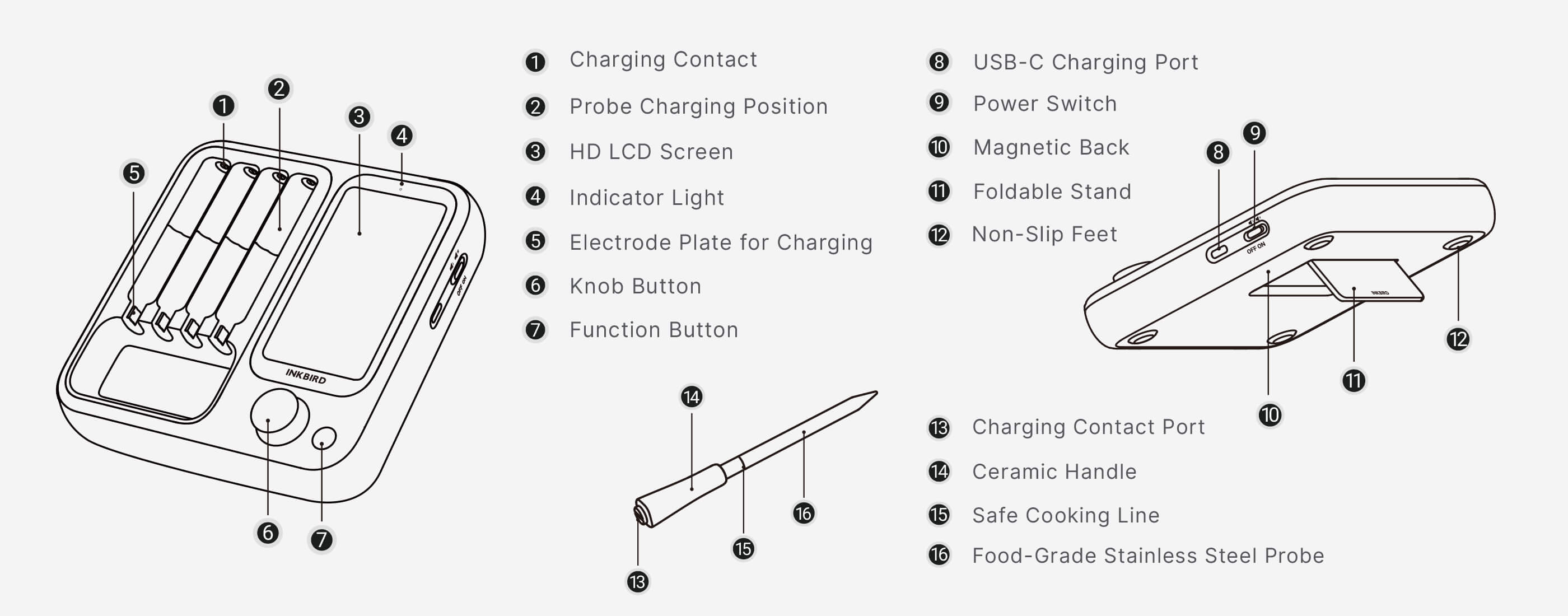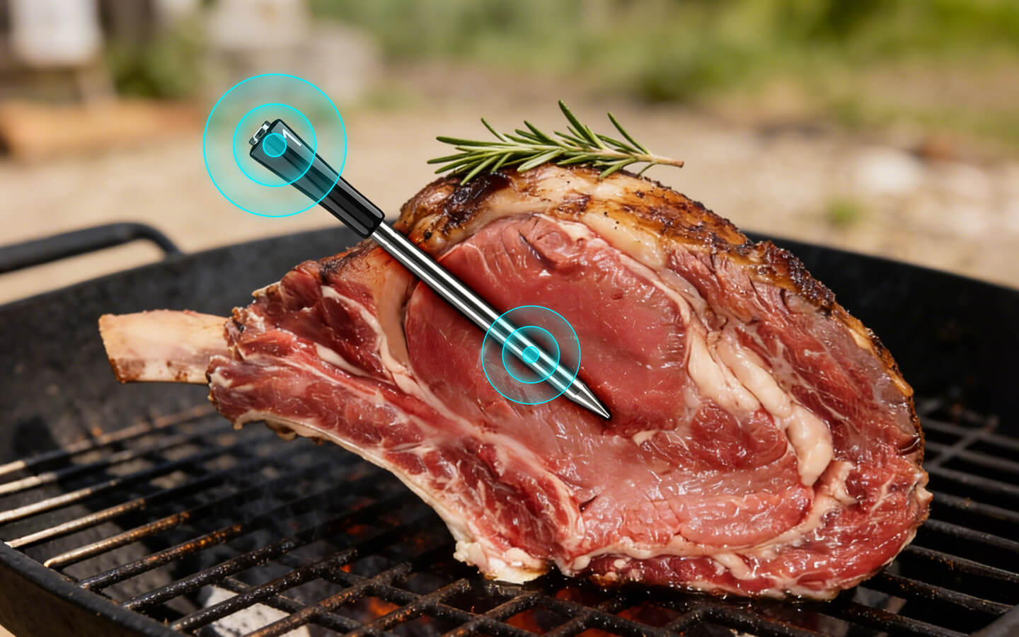 Dobbelt sensorer i hver sonde registrerer mad- og omgivelsestemperaturer samtidig og dækker et internt område på 14~212℉ og et omgivelsesområde på 32~572℉ med en nøjagtighed på ±1,8℉ for at sikre, at dine retter altid er tilberedt til perfektion.