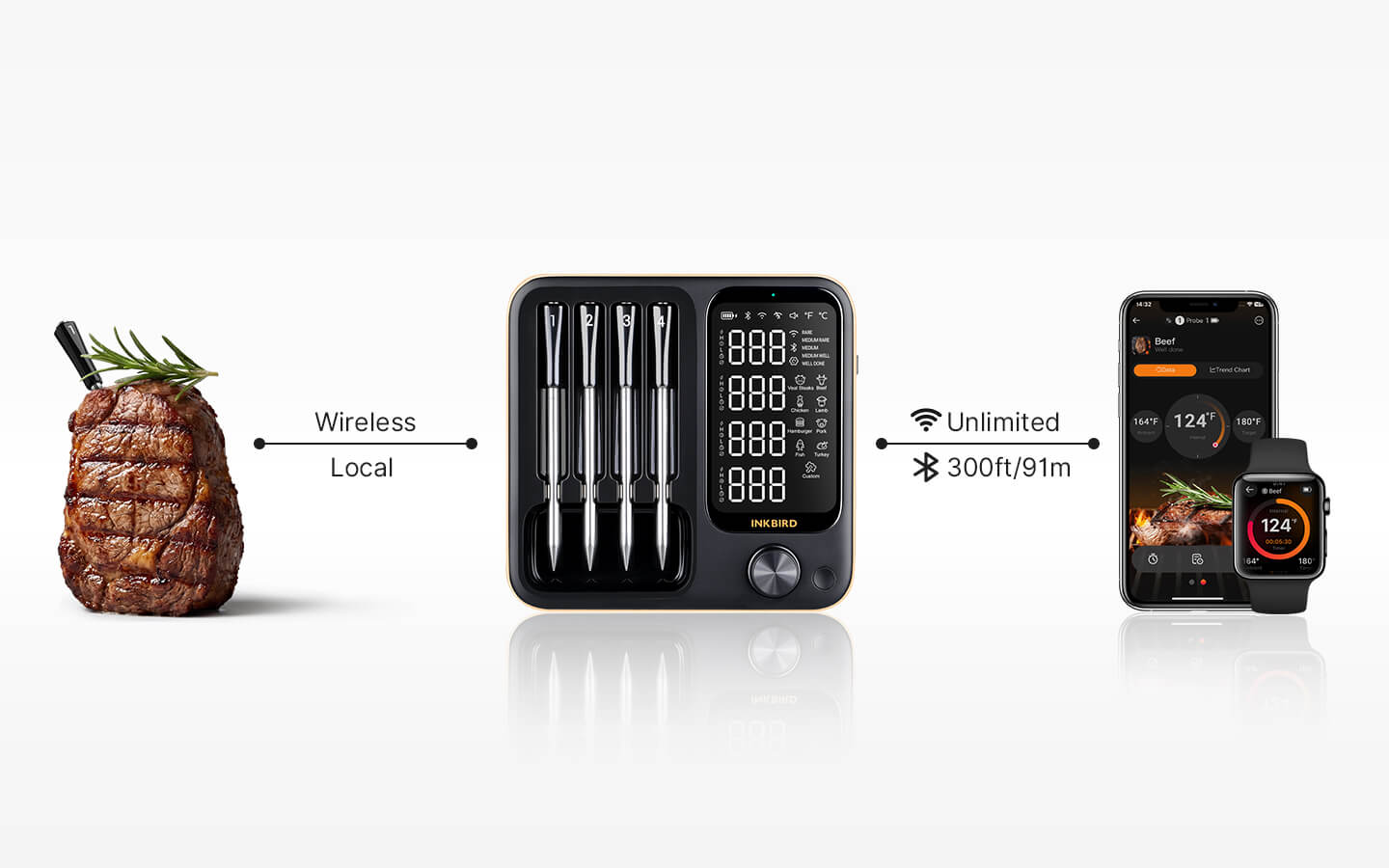 Dette smarte termometer tilbyder fleksible overvågningsmuligheder, der tillader fjernstyring via app gennem 2,4 GHz WiFi (ubegrænset forbindelsesområde) eller Bluetooth 5.4 (op til 91 m/300 fod), samt direkte temperaturaflæsninger fra hver probe på basens display i lokal app-fri tilstand.