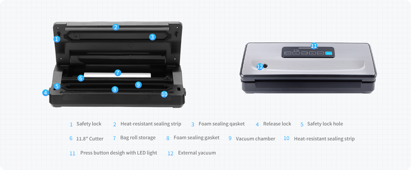 | Package Contents: | Vacuum Sealer INK-VS02 *1 Vacuum Sealer Bag (8x11.8") *5 Roll-Up Bag (11x118") *1 Air Suction Hose *1; User Manual *1 Heat-Resistant Tap *1; Contton Seal *1 Post-It Sticker *1 |