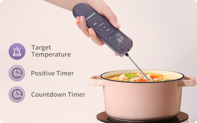 ● Fonctions de minuterie polyvalentes, minuterie positive, minuterie de compte à rebours et alarmes de température cible