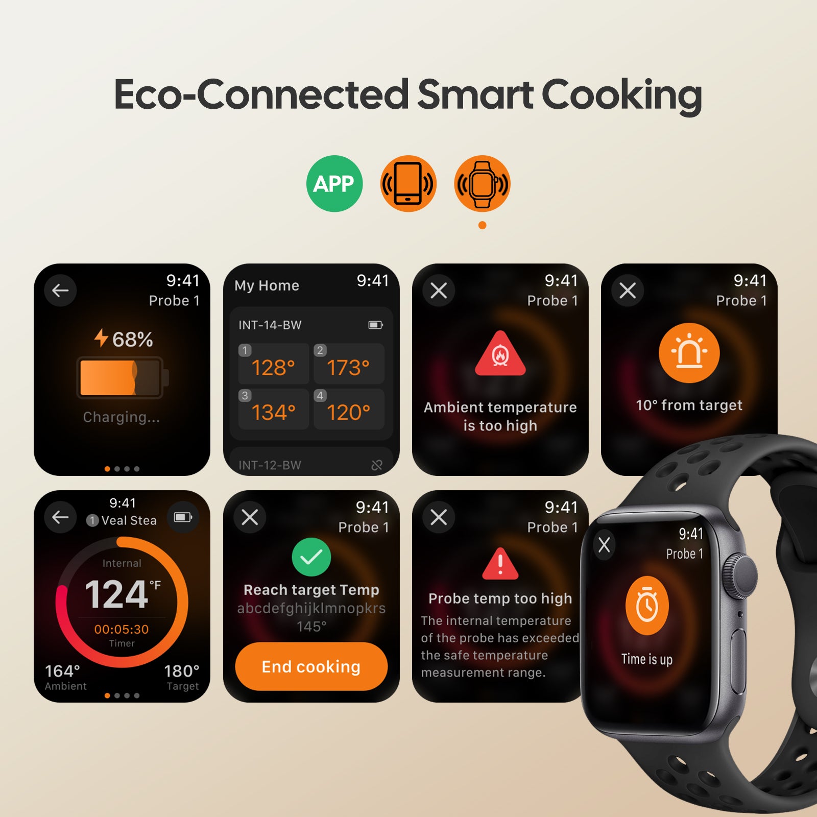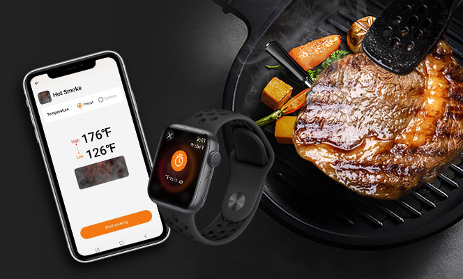 Ottieni risultati di cottura perfetti con 28 menu preset per carne, più allarmi e timer, oltre a una capacità di archiviazione dati offline di 80 minuti. Puoi anche monitorare i progressi e ricevere avvisi direttamente sul tuo Apple Watch.