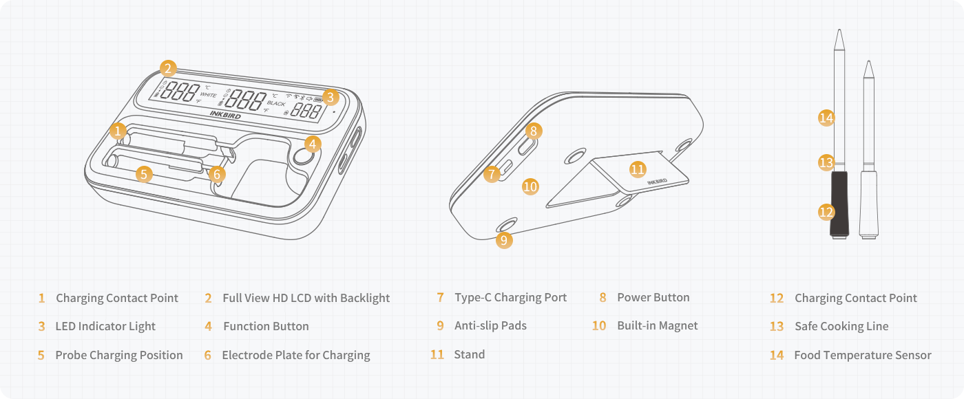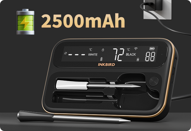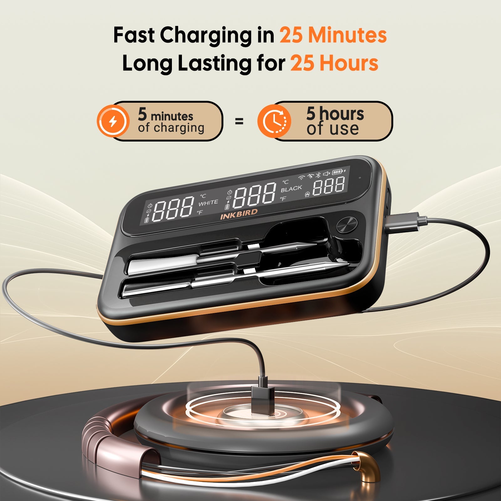 Con una batteria al litio da 2500mAh, ogni sonda si carica completamente nella base in soli 25 minuti e dura per 25 ore di utilizzo continuo, perfetta per il monitoraggio della temperatura a lungo termine come la cottura sous vide e l'affumicatura durante la notte.