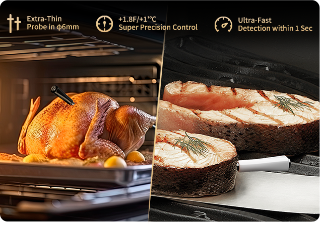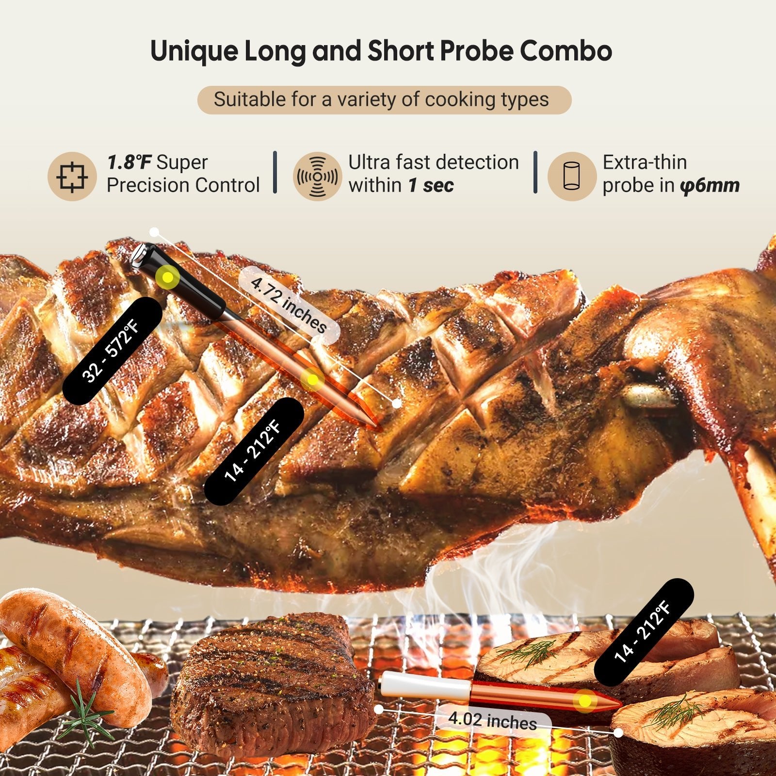 La sonda lunga 4,72"/12cm e la sonda corta 4,02"/10,2cm sono perfette per cucinare vari tipi di carne, offrendo entrambe tempi di risposta rapidi e alta precisione. La sonda più lunga può anche monitorare la temperatura del forno contemporaneamente.