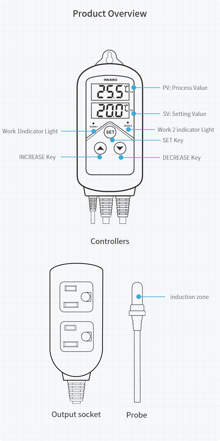 ● Dubbel displayvenster, kan gemeten temperatuur en ingestelde temperatuur tegelijk weergeven.