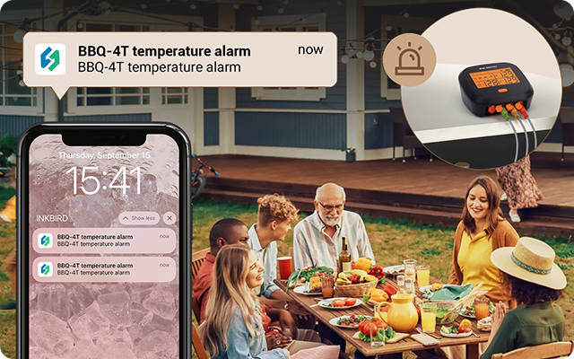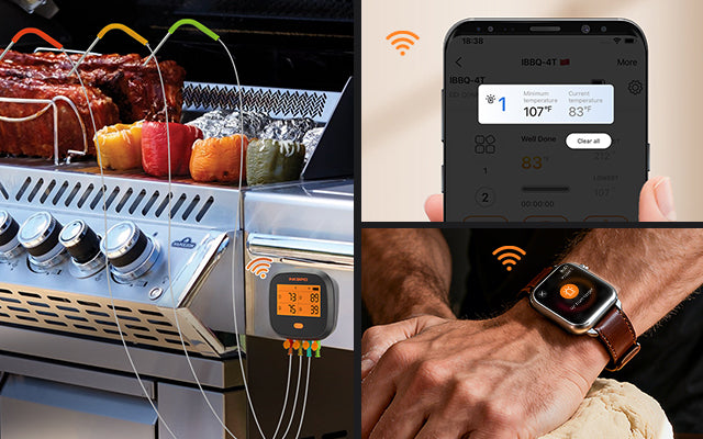 IBBQ-4T maakt verbinding met uw telefoon via 2,4 GHz WiFi voor externe monitoring en bediening. Wanneer uw aangepaste temperatuur is bereikt, ontvangt u een waarschuwing in de app, op uw Apple Watch en van het apparaat zelf om overgaring te voorkomen.