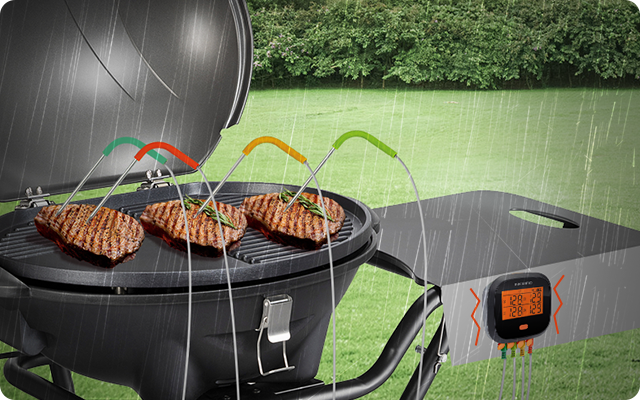 IBBQ-4T is waterdicht met een IPX3-classificatie, wat betekent dat het ook buiten gebruikt kan worden op regenachtige dagen. Bovendien zorgt de magnetische achterkant ervoor dat je het op elk metalen oppervlak kunt plakken voor een verbeterde grillervaring.