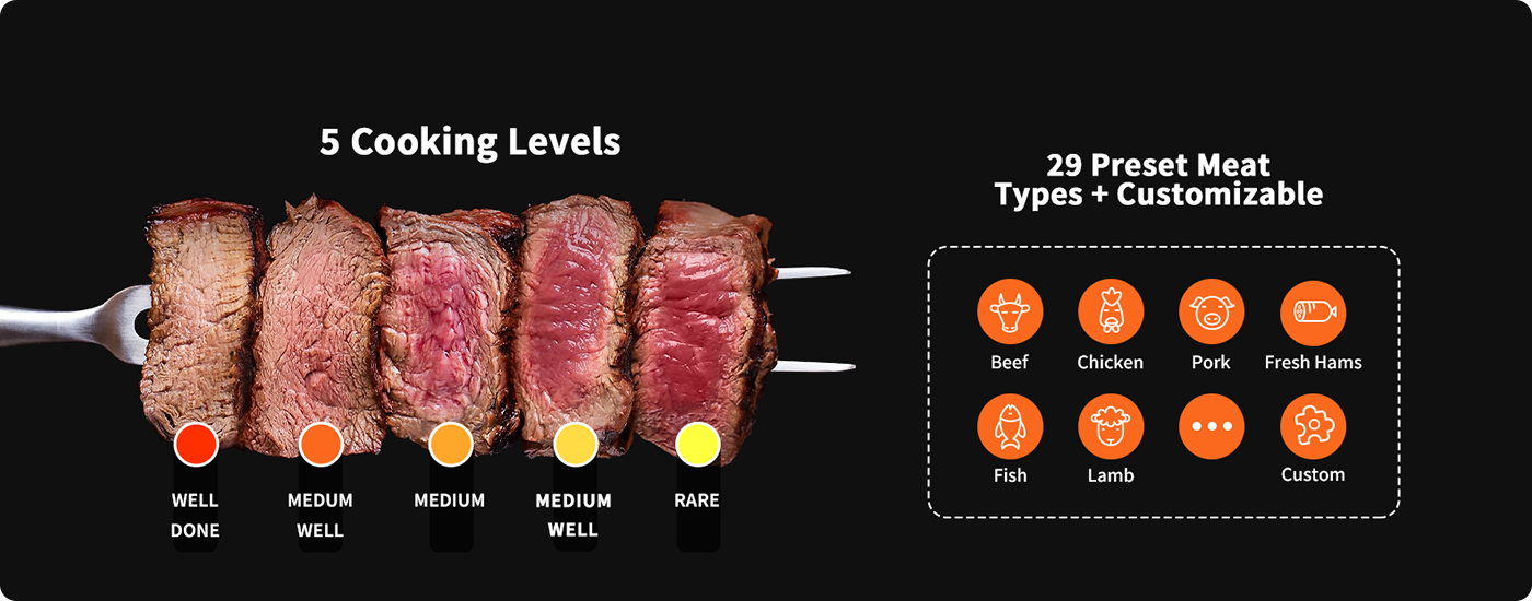 The free app presets 29 meat menus with USDA-recommended cooking temperature, stores up to 2 hours of offline data and offers multiple alarms and timers to help you cook juicy, tender meat.
