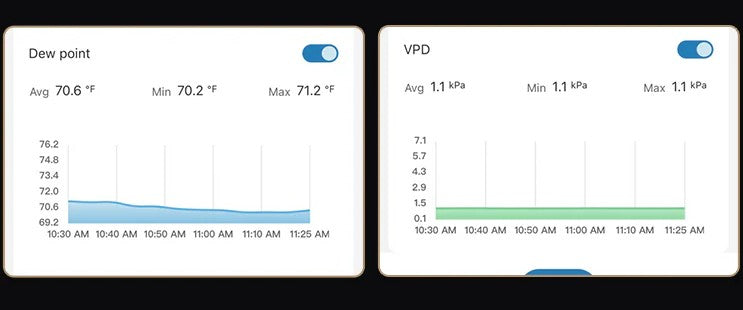 The app visualizes temperature, humidity, VPD and dew point data in graph form, with the capability to export up to 2 years of history. Additionally, the monitor itself can store up to 300 days of offline data.