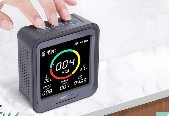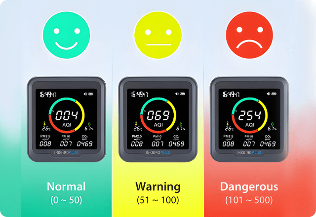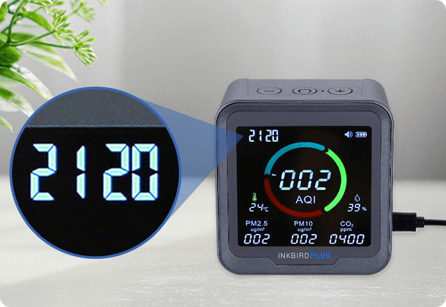 When the AQI exceeds 100 and the buzzer is on, the PTH-9A will sound an alarm. To silence it, just long press the plus button at the top.