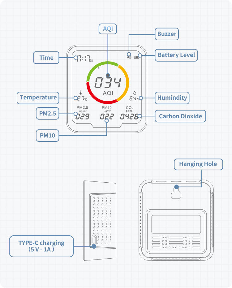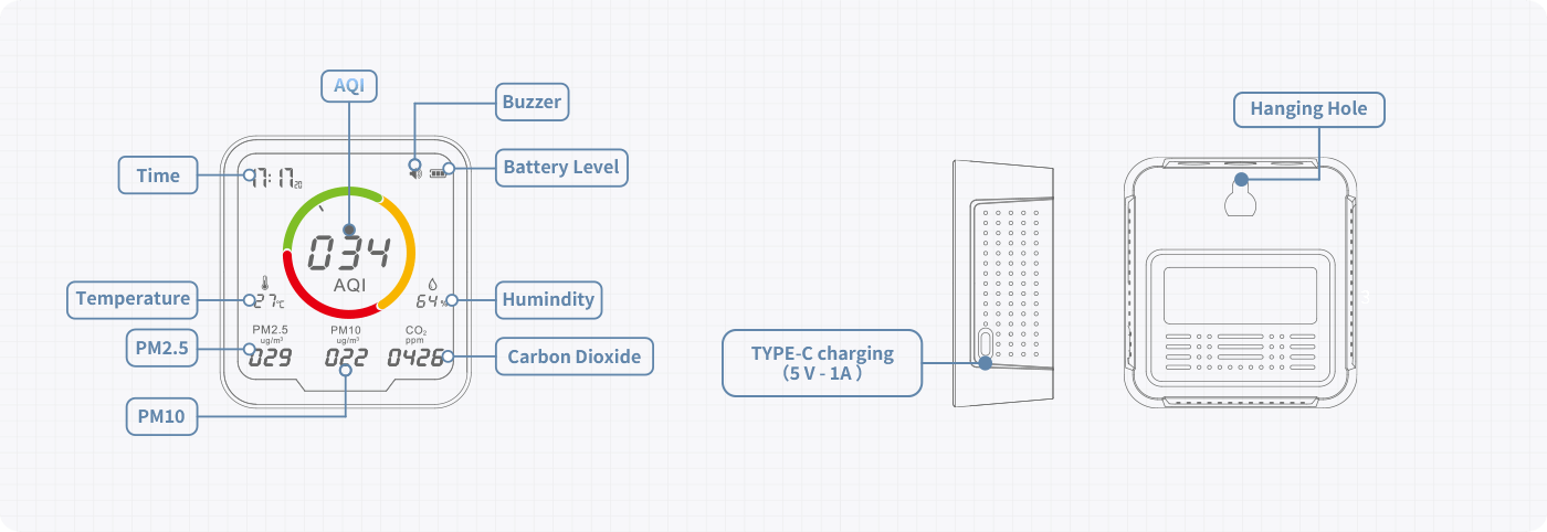 | Data Detection: | CO2,Temperature, Humidity,PM2.5, PM10,AQI |