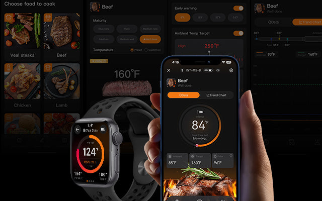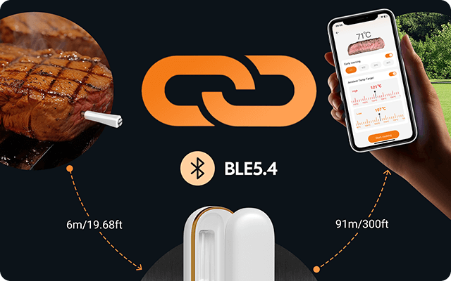 Com Bluetooth 5.4 avançado, o INT-11S-B tem uma ligação forte e estável até 300 pés (91 metros) em linha de visão clara. Isto significa que pode monitorizar a sua cozedura a partir de qualquer lugar da sua casa ou quintal sem perder a ligação.