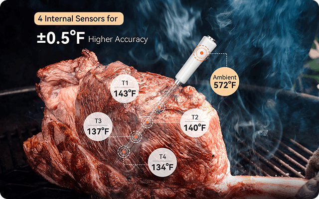 Quatro sensores de alimentos fornecem controlo preciso do ponto de cozedura com uma precisão de ±0,5°F/±3°C, enquanto um sensor ambiente adicional mede temperaturas do forno até 572°F/300°C.