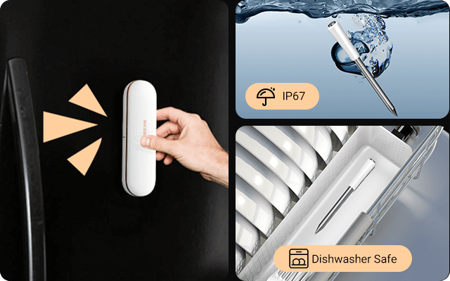 A sonda de carne sem fios possui uma sonda em aço inoxidável resistente à ferrugem e uma pega durável em cerâmica resistente ao calor. Tem classificação IP67 para ser à prova de água e é segura para lavar na máquina de lavar loiça.