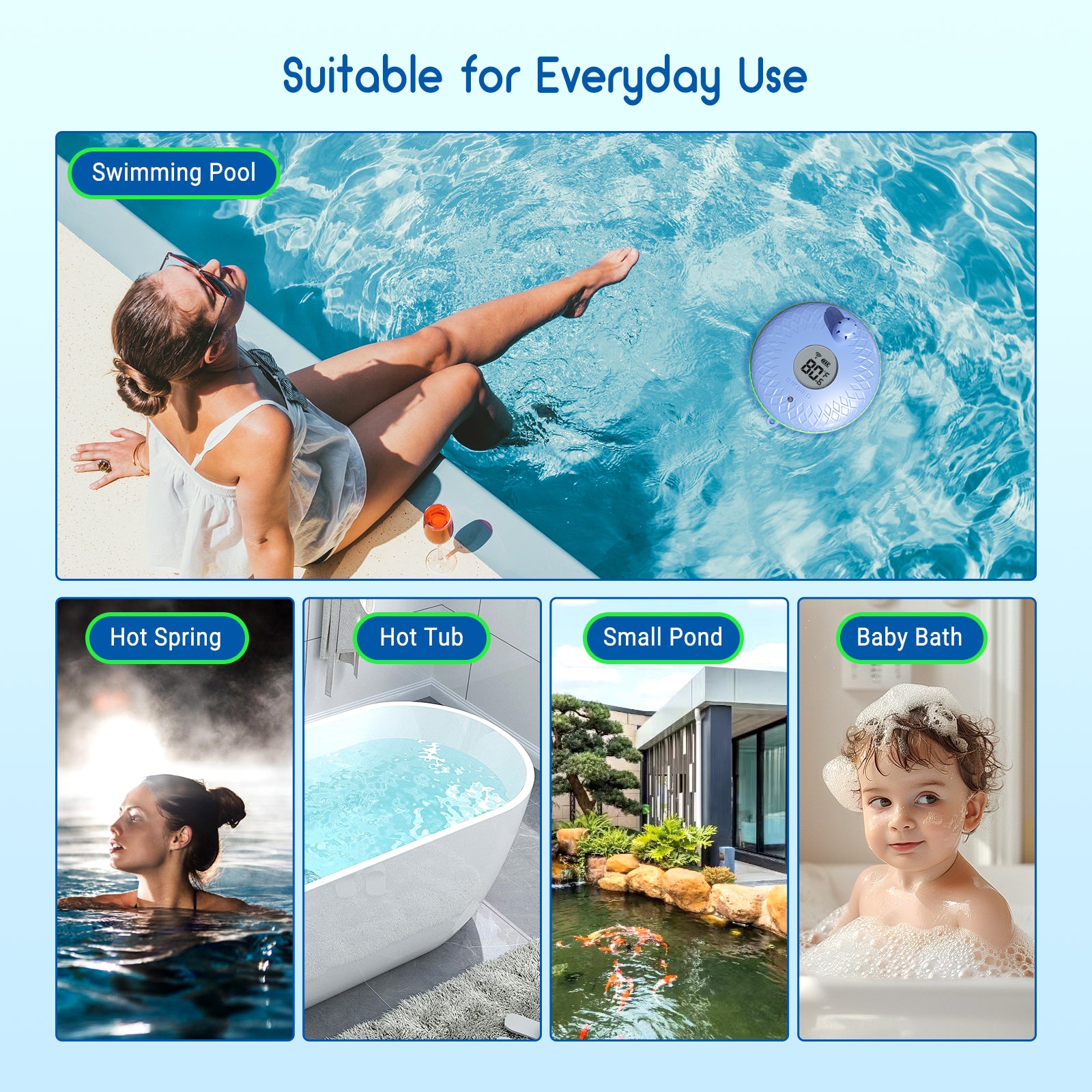 Este termómetro avançado para piscinas apresenta uma sonda de temperatura de alta precisão, sensível e fiável, bem como impermeabilidade IPX7 para garantir que flutua facilmente na piscina. Com conectividade Bluetooth 5.0, pode controlá-lo remotamente e monitorizar a temperatura da piscina a partir do seu smartphone, garantindo que pode nadar confortavelmente a temperaturas ótimas.