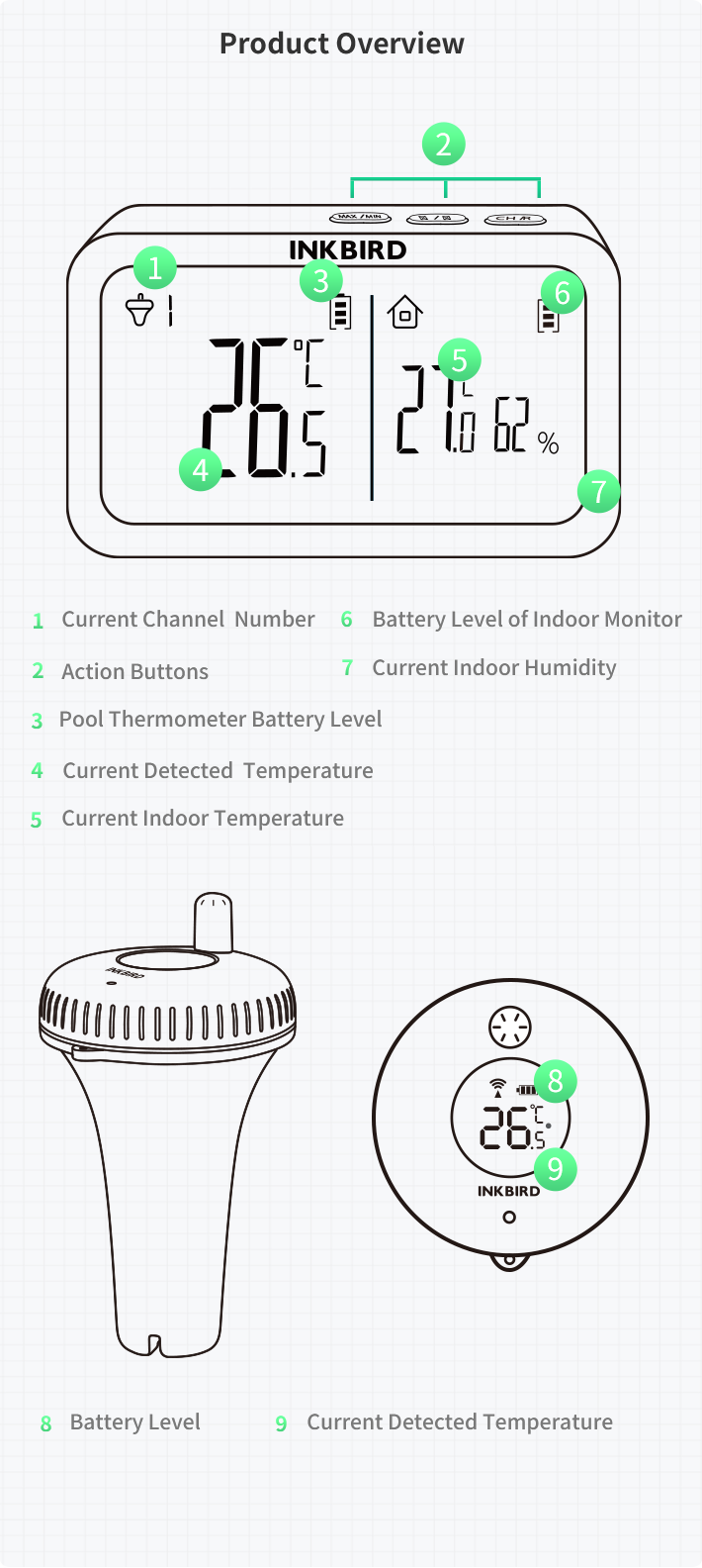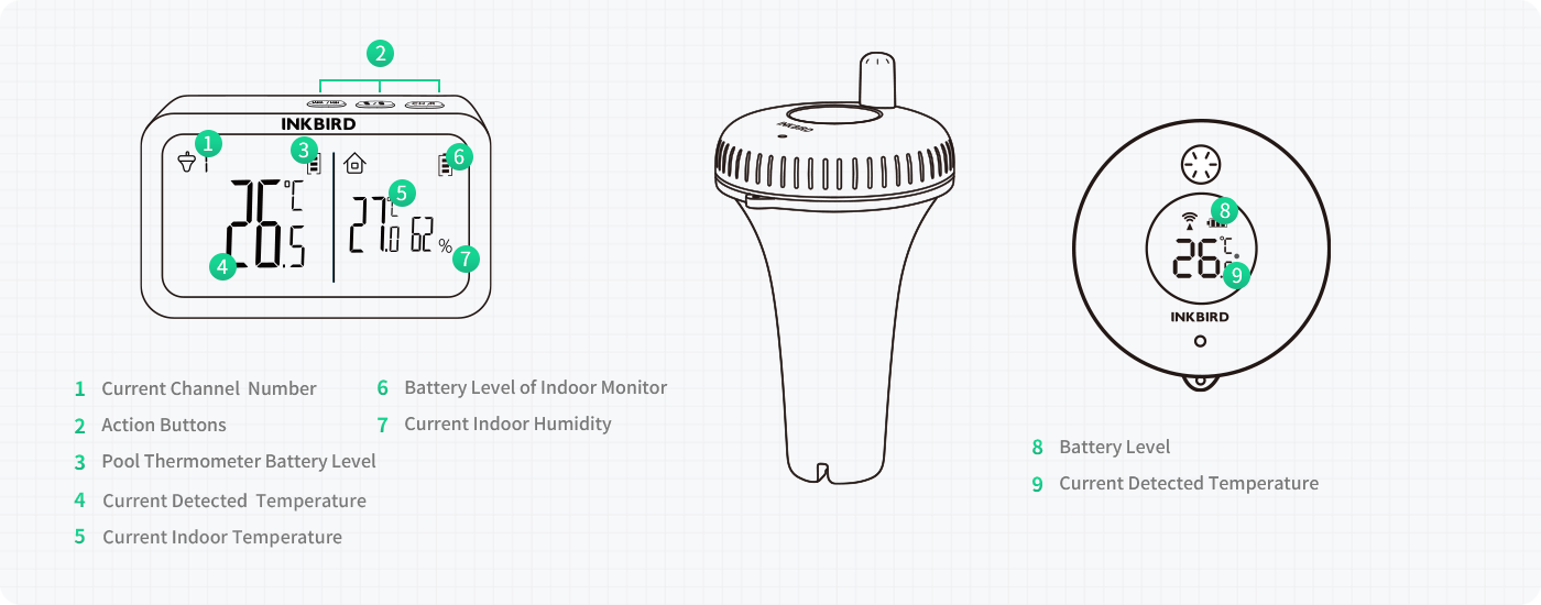 | Temp Measurement Range: | Pool Thermometer: -40~158℉/-40~70℃ Indoor Monitor: -40~140℉/-40~60℃ |